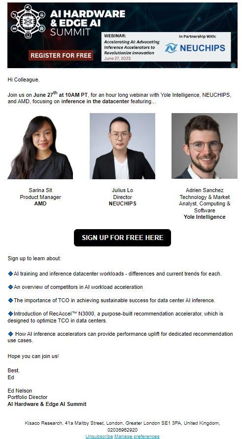 Kisaco Research designed a comprehensive marketing strategy that included targeted email campaigns, social media promotion, and partnership outreach. The promotional assets featured engaging visuals and compelling content that highlighted the unique value proposition of NeuChips.